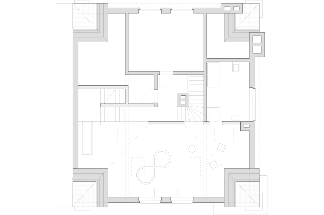 Das Haus aus den fünfziger Jahren wurde den wechselnden Bedürfnissen einer jungen Familie angepasst. Ein hohes und lichtdurchflutetes Spielzimmer unter dem Dach durchbricht die bestehenden Stockwerke und bildet den Endpunkt eines sich durch das Haus schlängelnden Erschließungsraumes. Im Dachgeschoss wurde ein neues Kinderzimmer eingerichtet.